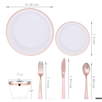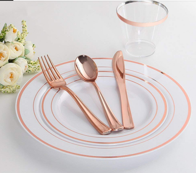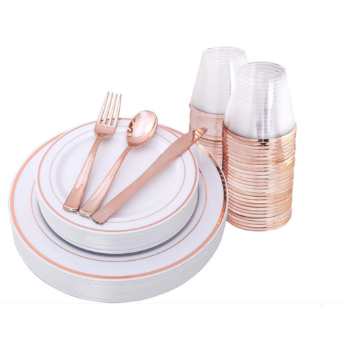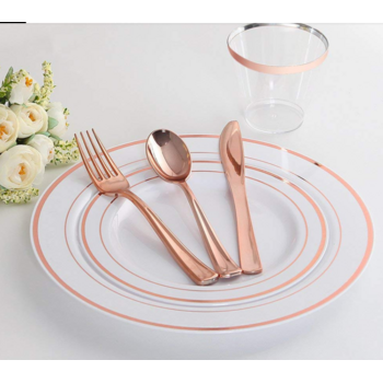 25 Person 150pc Plastic Dinner Plate Set - White/Rose Gold