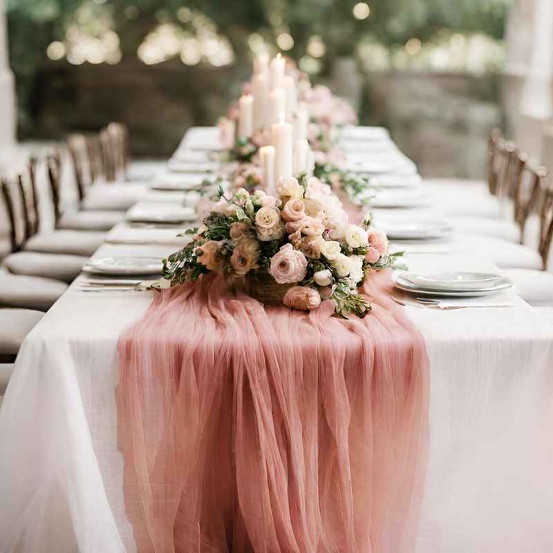 Available in an array of captivating colors, our Cheesecloth Table Runners can be effortlessly matched to your wedding palette, making them the ideal choice for customization and personalization. From soft and dreamy pastels to rich and vibrant tones, our diverse color selection ensures there's a perfect runner for every wedding style and theme.