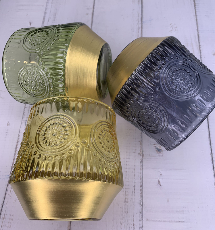 Tapered design patterned glass votive holder with gold base