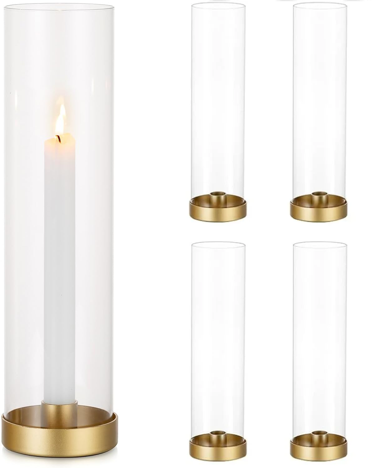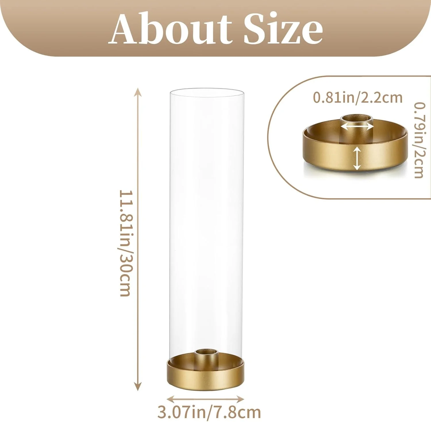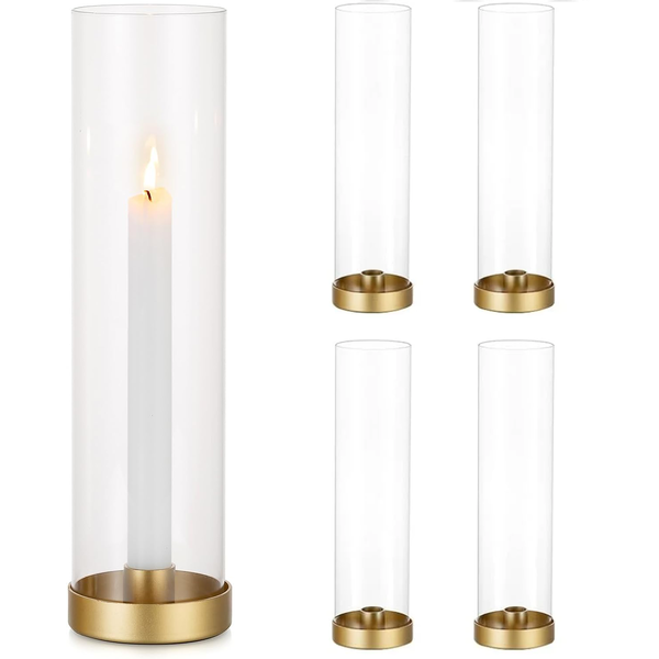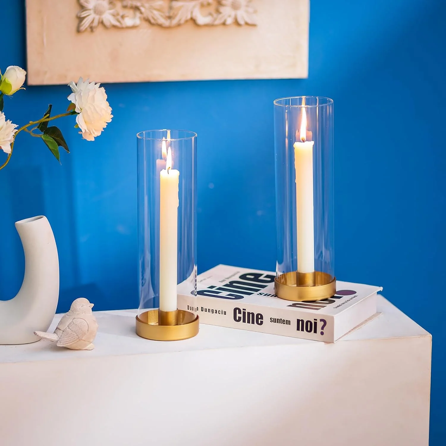 Create a warm and inviting atmosphere with our dinner/taper candle holder set, designed for style and practicality. This set includes 4 holders, each with a sturdy gold base and a clear glass hurricane sleeve to protect the candle flame. The glass sleeve measures 25cm in height and 6cm in diameter, and the base includes a 2cm wide insert for standard taper candles.