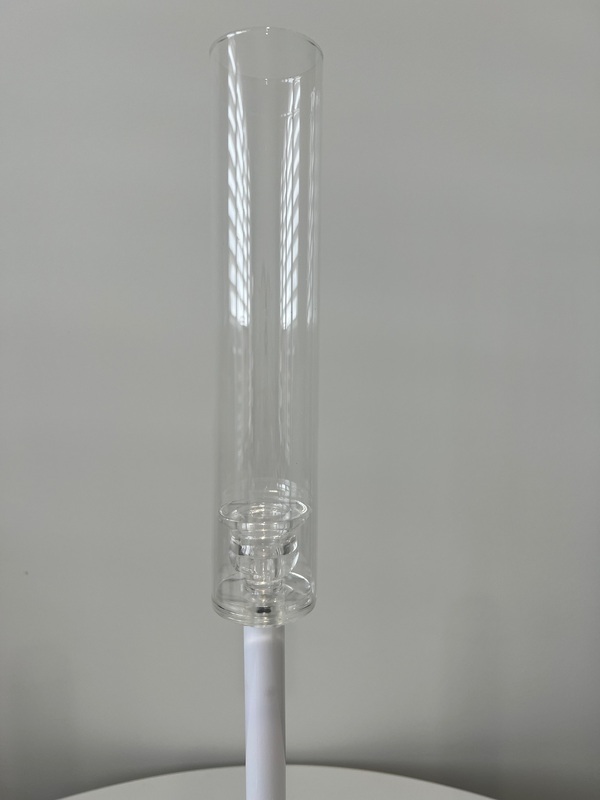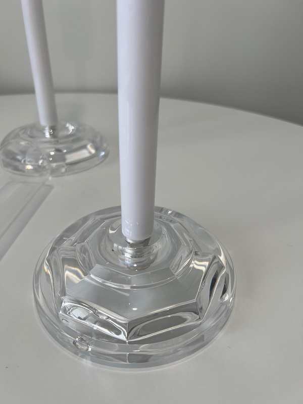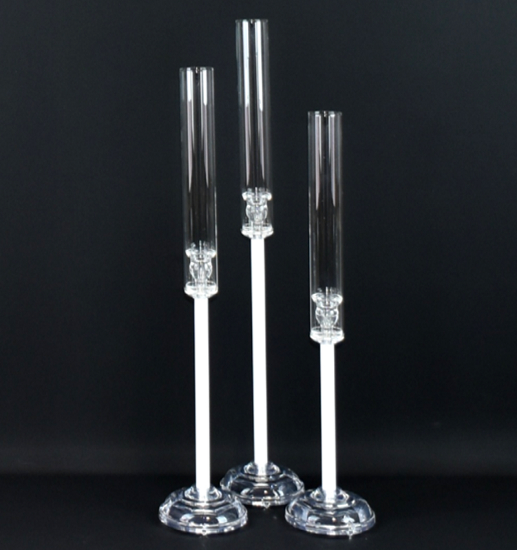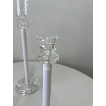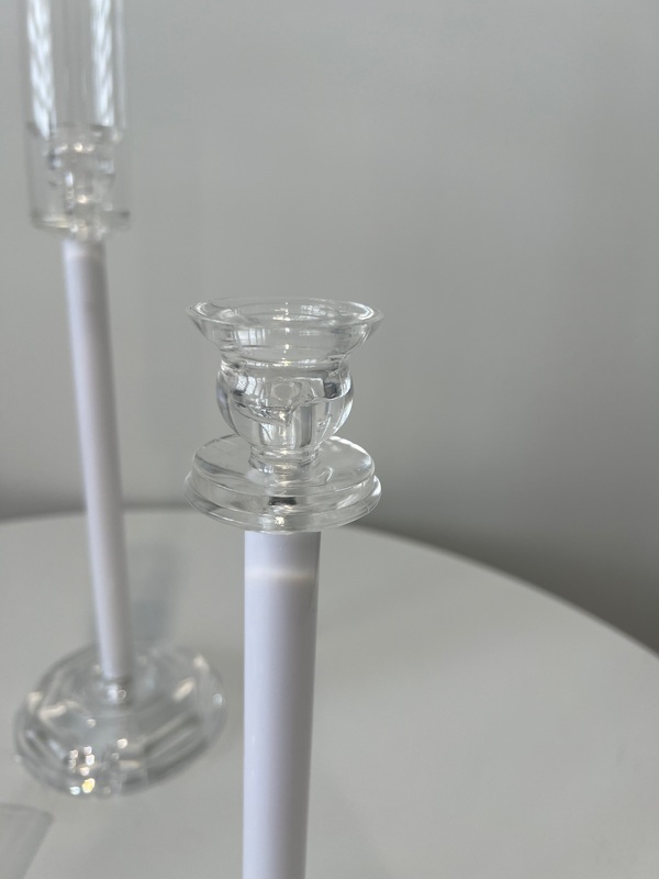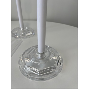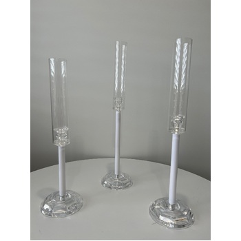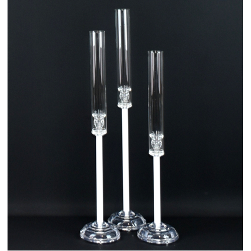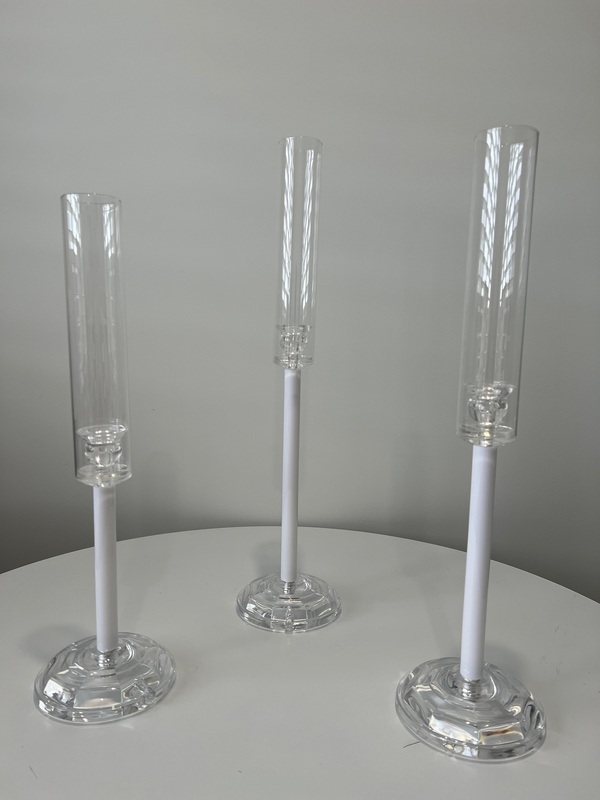 Create a stunning centrepiece display with this elegant Set of 3 Candlestick Candelabras. Featuring clear acrylic bases (13cm), sleek white acrylic stems, and tall glass windlight covers(25cm), they offer a modern take on a classic design. The varying heights add visual interest and the glass covers protect your candles, making them ideal for both indoor and outdoor settings.