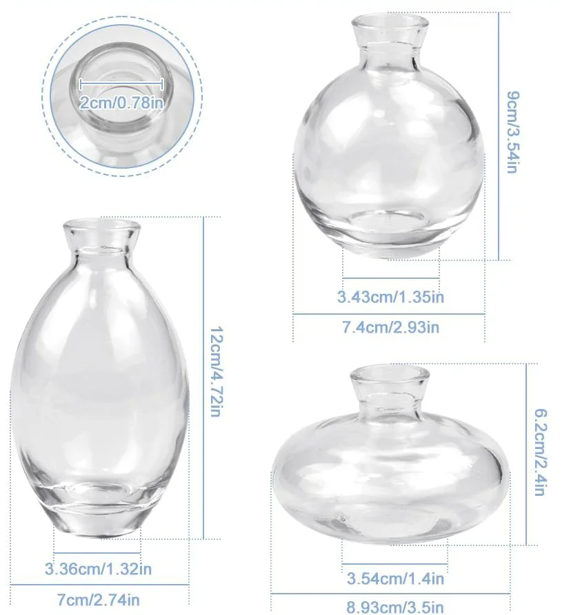 Made from clear glass, these vases suit fresh flowers, dried stems, or artificial florals. Their compact size makes them ideal for table styling, signage displays, and clustered arrangements where subtle floral detail is required.