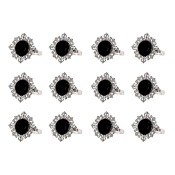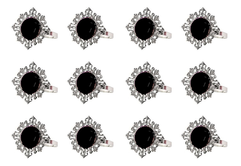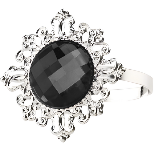 These stunning pack of 12 black diamond Ring-style napkin rings are crafted from metal. Each ring features a sparkling faux diamond and intricate filigree detailing, measuring 5cm in diameter (diamond and filigree) and the ring part fitting napkins up to 4cm wide.