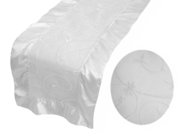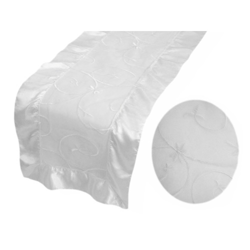 Approximate Measurements: 14" x 108" embroidered organza including 3" satin borders;