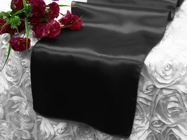 Measuring 28cm in width and 245cm in length, our Black satin table runners drape a variety of sizes and shapes in tables to create a touch of opulence. The smooth, lustrous fabric captures the light, creating a mesmerizing play of reflections that adds depth and dimension to your setting.