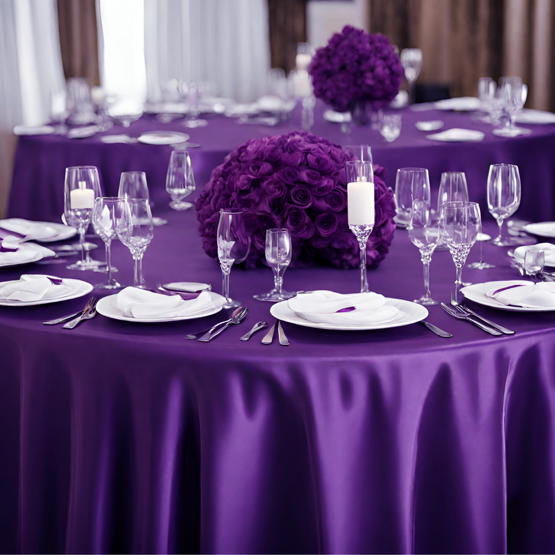 Our Round Satin Tablecloth in Purple is perfect for brides or decorators who are planning a wedding or special event and want to create a memorable and visually stunning atmosphere.