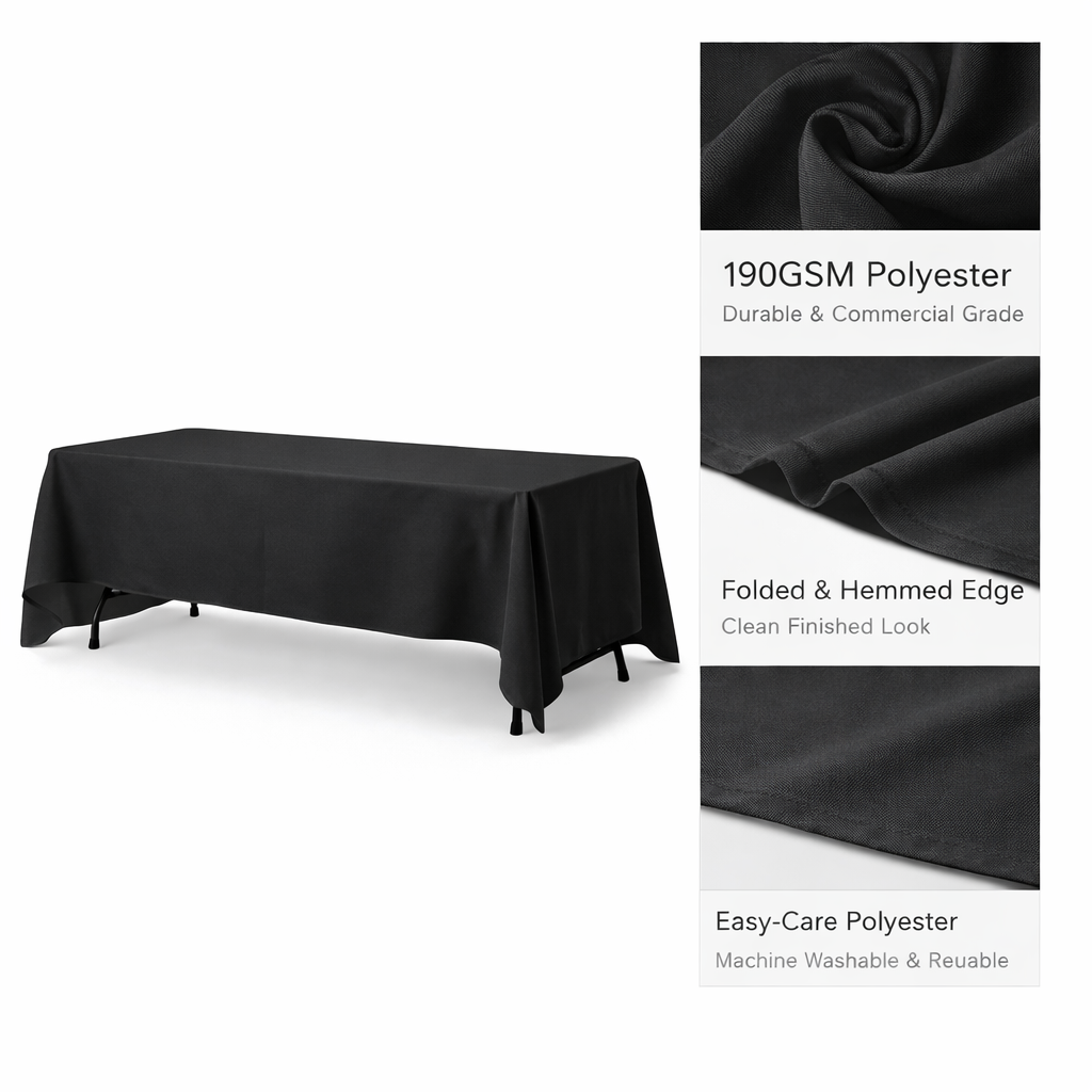 Made from commercial-grade polyester, this tablecloth offers a smooth and consistent finish with durable, easy-care performance. It is suitable for both one-off events and repeated use across venues and event setups.
