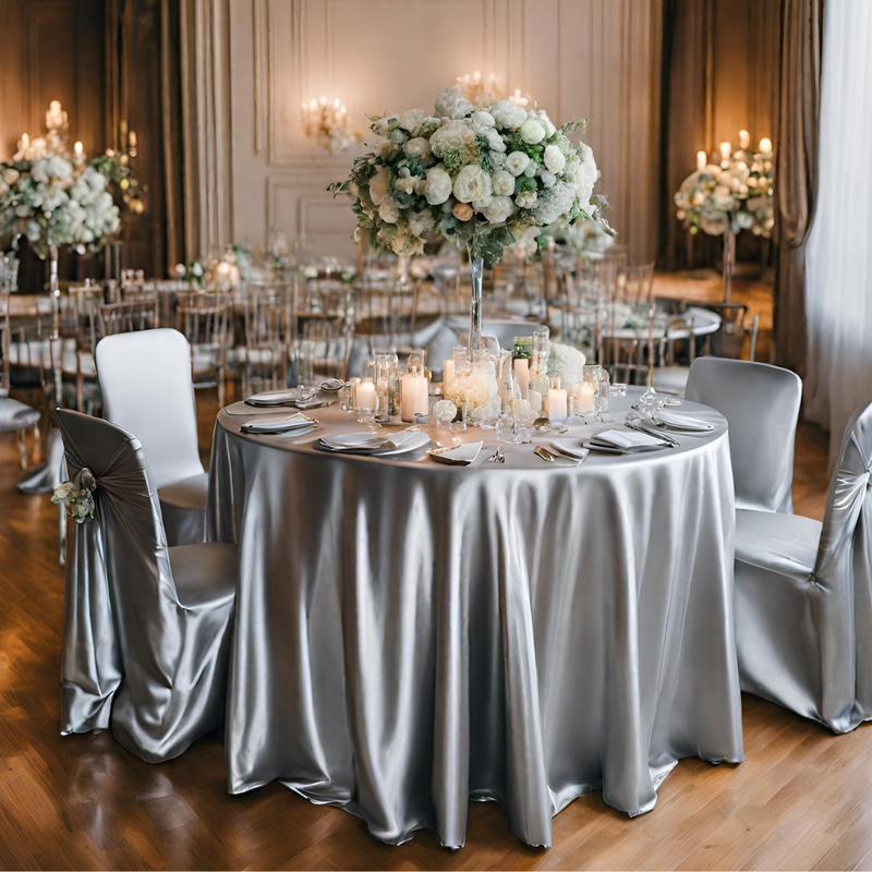 - Stand Out and Be Different: Step away from the traditional white polyester tablecloths and make a unique statement with our silver satin tablecloth. Your guests will be captivated by the elegance and beauty it brings to your event.